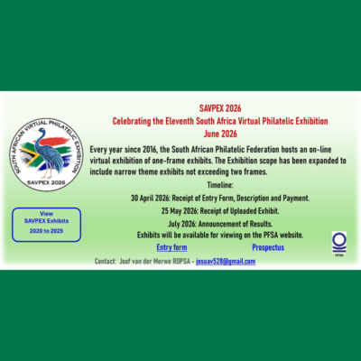 The Philatelic Federation of South Africa (PFSA) has announced the eleventh South African Virtual Philatelic Exhibition, SAVPEX 2026, featuring one- or two-frame exhibits, which will be available for viewing on the PFSA website.