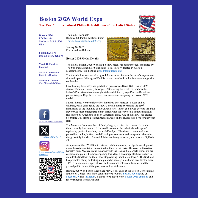 As sponsor of the 12th U.S. international exhibition medal, the Spellman’s logo will grace the red presentation boxes lined in blue velvet. Brian Howard, its Executive Director, said, “We are proud to partner with the Boston 2026 World Expo, and are eagerly anticipating the show’s opening this May. I encourage all show visitors to include the Spellman on their list of stops during their time in town.” The Spellman has promoted stamp collecting and philatelic heritage at its home near Boston since 1963. The museum is open all year and welcomes collectors, families, and the general public for exhibits, programs, and special events.