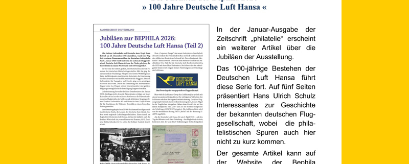 The January issue of the magazine Philatelie features another article about the exhibition’s anniversaries. The 100th anniversary of Deutsche Luft Hansa continues this series. Over five pages, Hans Ulrich Schulz presents interesting facts about the history of the well-known German airline, with philatelic traces also featuring prominently.