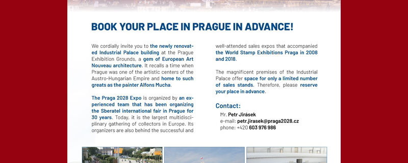 The PRAGA 2028 EXPO organisers are inviting the philatelic world to the newly renovated Industrial Palace building at the Prague Exhibition Grounds, a gem of European Art Nouveau architecture.