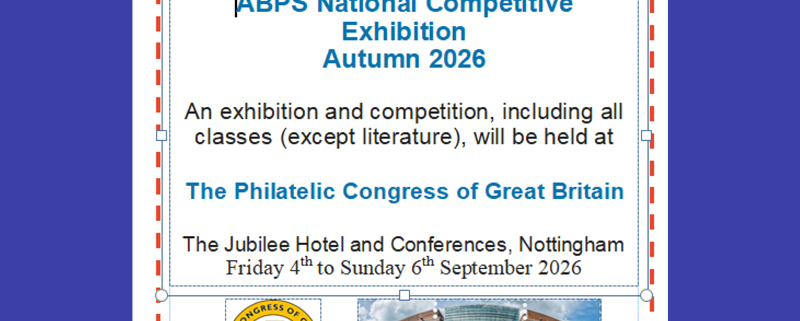 In 2026, the ABPS National Exhibition will take place in Nottingham during The Philatelic Congress of Great Britain from the 4th to 6th September 2026. The venue is The Jubilee Hotel and Conference Centre, Triumph Road, Nottingham NG7 2TU (https://nottinghamvenues.com/hotel/the-jubilee-hotel-conferences). General information will be available on the ABPS website, abps.org.uk. Entry to ABPS National Exhibitions is normally via this ABPS website, abps.org.uk/exhibiting. Potential exhibitors might like to know of the current Special Offer available by generous sponsorship of the Philatelic Fund. See the website for details.
