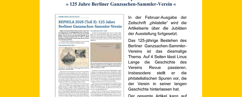 The February issue of Philatelie continues the series of articles on the exhibition’s anniversaries. The 125th anniversary of the Berlin Postal Stationery Collectors’ Association is the theme this time. Linus Lange reviews the history of the association over four pages. In particular, he presents the philatelic traces that the association has left behind in its long history.
